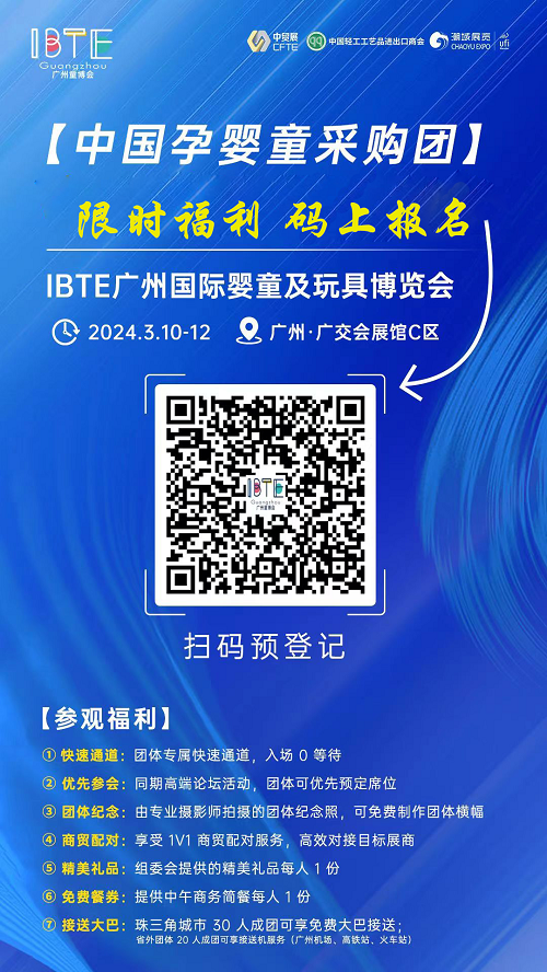 由中國對外貿易廣州展覽有限公司、中國輕工工藝品進出口商會和廣東潮域展覽有限公司強強聯手,共同主辦的2024 IBTE廣州國際嬰童及玩具博覽會(簡稱:IBTE廣州童博會)將于2024年3月10-12日在廣州•廣交會展館C區舉辦。本屆展會定檔內外貿采購旺季3月,助力展商搶抓春季內外貿易采購及跨境電商選品先機,迎接2024年中國嬰童用品行業開年第一展。同期系列展包括IBTE廣州潮玩展、IBTE廣州嬰童用品展等。