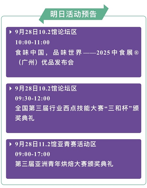 9月28日是展會最后一天,組委會特別提醒未到場觀眾:將舉辦"食味中國,品味世界——2025F2C中食展®(廣州)優品發布會"、第三屆亞洲青年烘焙大賽頒獎典禮、全國第三屆行業西點技能大賽“三和杯”頒獎典禮。