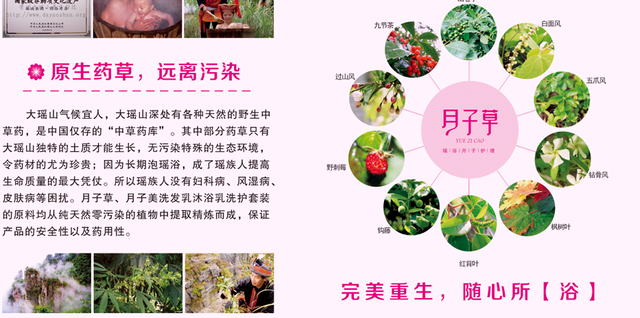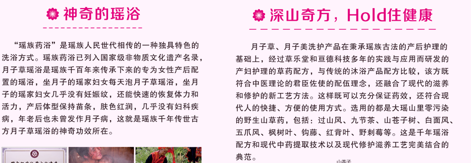 坐月子是產后女人的頭等大事,是女人恢復青春、美麗與健康的最重要的時刻。草樂堂藥業和亙德科技的專家組,經過多年在大瑤山里,對深山瑤醫的探索和研究,研制出適合產后女性使用的月子草/月子美修護洗發乳和月子草/月子美滋養沐浴乳,解決了現代女性產后在月子里不敢洗發和沐浴的難題。 |