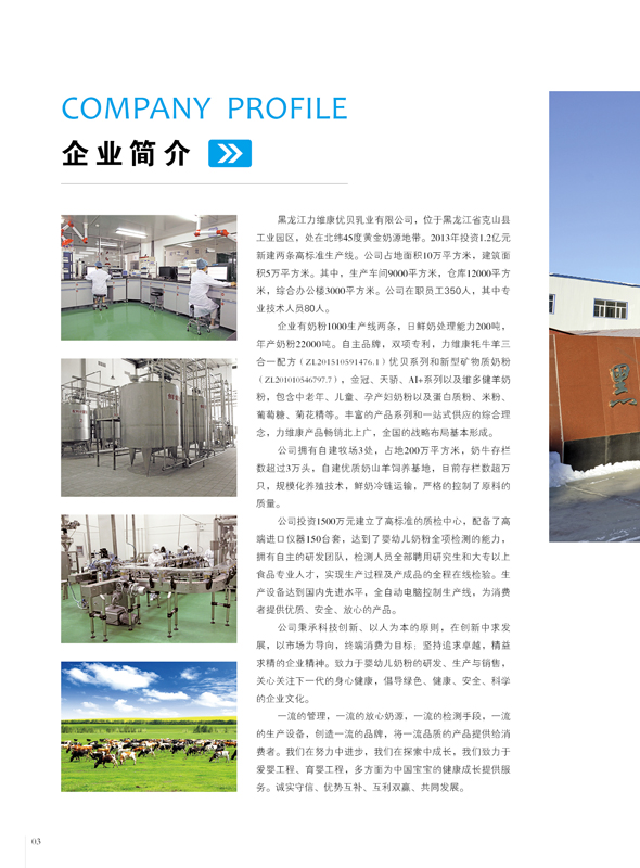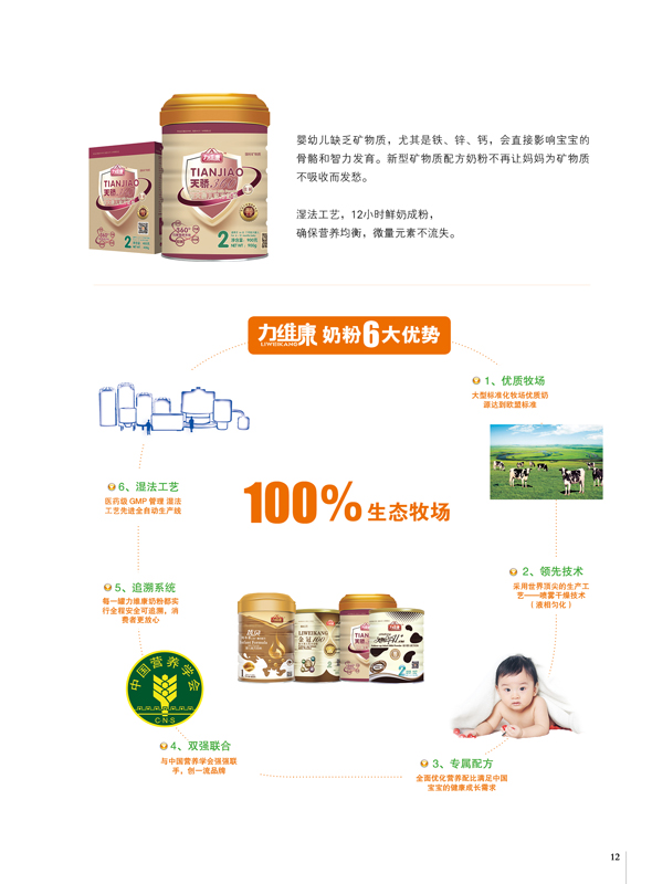 企業有奶粉1000生產線兩條,日鮮奶處理能力200噸,年產奶粉22000噸。自主品牌,雙項專利,力維康牦牛羊三合一配方(ZL201510591476.1)優貝系列和新型礦物質奶粉(ZL201010546797.7),金冠100系列以及天驕、愛嘉系列,包含中老年、兒童、孕產婦奶粉以及蛋白質粉、米粉、葡萄糖、菊花精等。豐富的產品系列和一站式供應的綜合理念,力維康產品暢銷北上廣,全國的戰略布局基本形成。 公司擁有自建牧場3處,占地200萬平方米,奶牛存欄數超過3萬頭,規模化養殖技術,鮮奶冷鏈運輸,嚴格的控制了原料的質量。 公司投資1500萬元建立了高標準的質檢中心,配備了高端進口儀器150臺套,達到了嬰幼兒奶粉全項檢測的能力,擁有自主的研發團隊,檢測人員全部聘用研究生和大專以上食品專業人才,實現生產過程及產成品的全程在線檢驗。生產設備達到國內先進水平,全自動電腦控制生產線,為消費者提供優質、安全、放心的產品。 公司秉承科技創新、以人為本的原則,在創新中求發展,以市場為導向,終端消費為目標;堅持追求卓越,精益求精的企業精神。致力于嬰幼兒奶粉的研發、生產與銷售,關心關注下一代的身心健康,倡導綠色、健康、安全、科學的企業文化。 一流的管理,一流的放心奶源,一流的檢測手段,一流的生產設備,創造一流的品牌,將一流品質的產品提供給消費者。我們在努力中進步,我們在探索中成長,我們致力于愛嬰工程、育嬰工程,多方面為寶寶的健康成長提供服務。誠實守信、優勢互補、互利雙贏、共同發展。 |