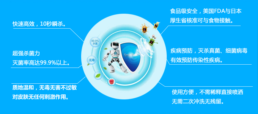 | 公司自主擁有美國SAFESANI TECH CORP創立研發團隊,擁有全球最先進的專業實驗室、化驗室,運用美、日、德等國高科技分子震蕩設備及獨有的分子排序轉變技術目前已成功研制出十大高端系列環保殺菌產品,應用范圍涵蓋了汽車、果蔬、寵物、男性、女性、兒童等專用領域。 莎霏(SAFESANI)系列健康滅菌產品,主要成分為皮米級次氯酸,經人民解放軍軍事科學院消毒檢測中心、廣東省微生物分析檢測中心的嚴格檢測,確認產品可10秒快速殺菌,殺菌率達99.9%以上,質地細致溫和,無毒無害,對皮膚無任何刺激作用。且使用方便,不需稀釋直接噴灑,無需二次沖洗無殘留。 |